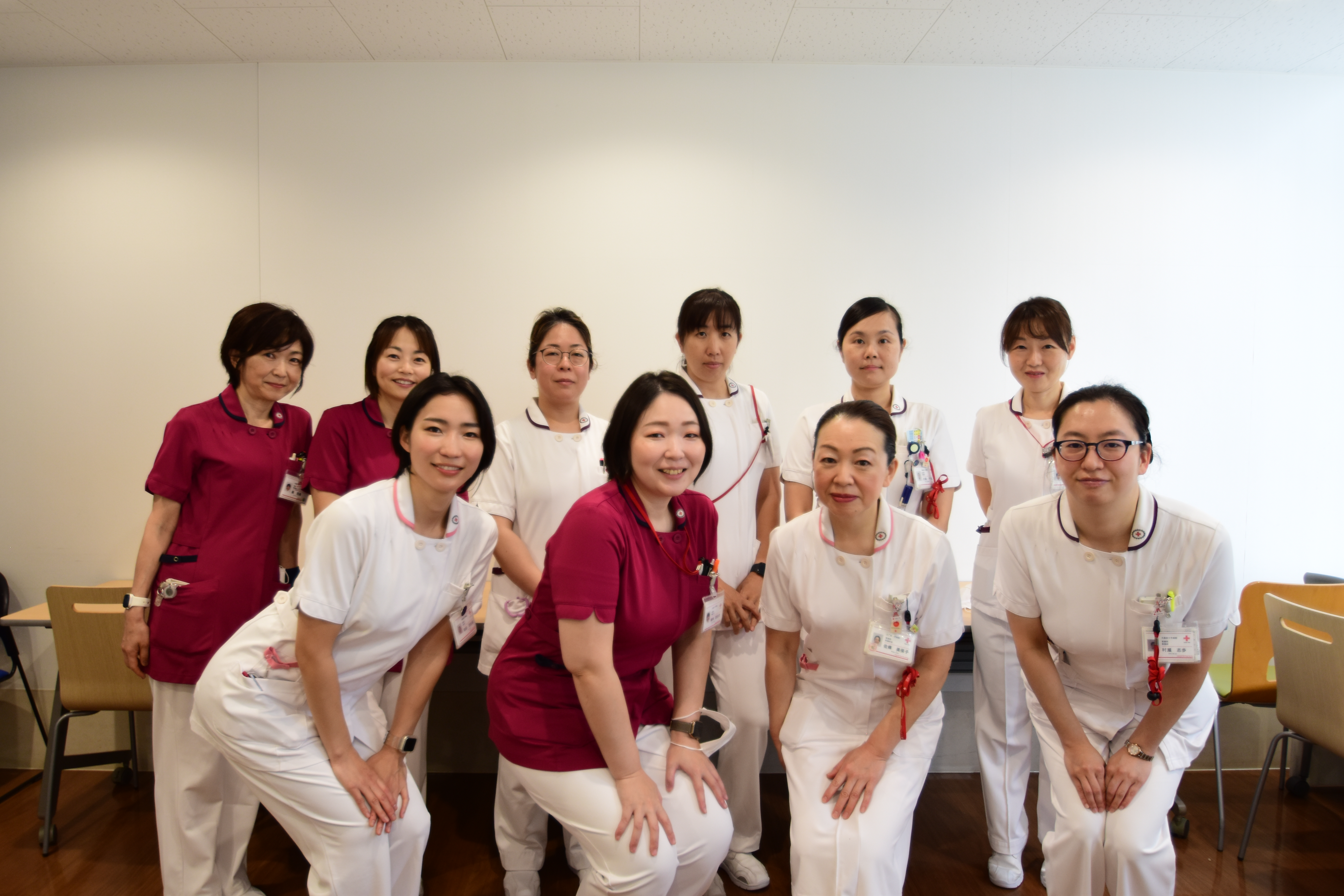外来1は様々な経験・経歴の看護師が働いています。家族の介護や育児中などでも、職員同士で悩み相談を行い、協力しながら楽しく生き生きと仕事をしています。仕事と家庭生活を両立しながら、患者さんが「心あたたまる」診療を受けていただけるよう努めています。