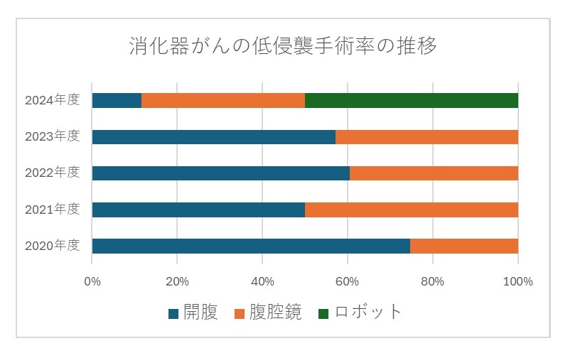 2024年4月から手術支援ロボット“ダヴィンチ”が本格的に稼働を開始し、当科では胃癌と大腸癌に対するロボット手術を積極的に行っています。精密な操作で切開、縫合を行うことができ、術中出血量や縫合不全など合併症発生率の低減が報告されています。